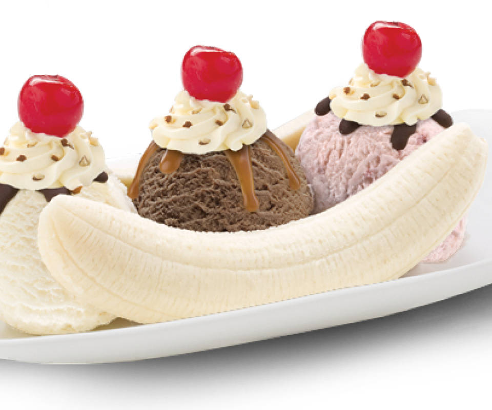 Banana with the lot: ice cream, whipped cream, hot fudge, chopped almonds & cherries.