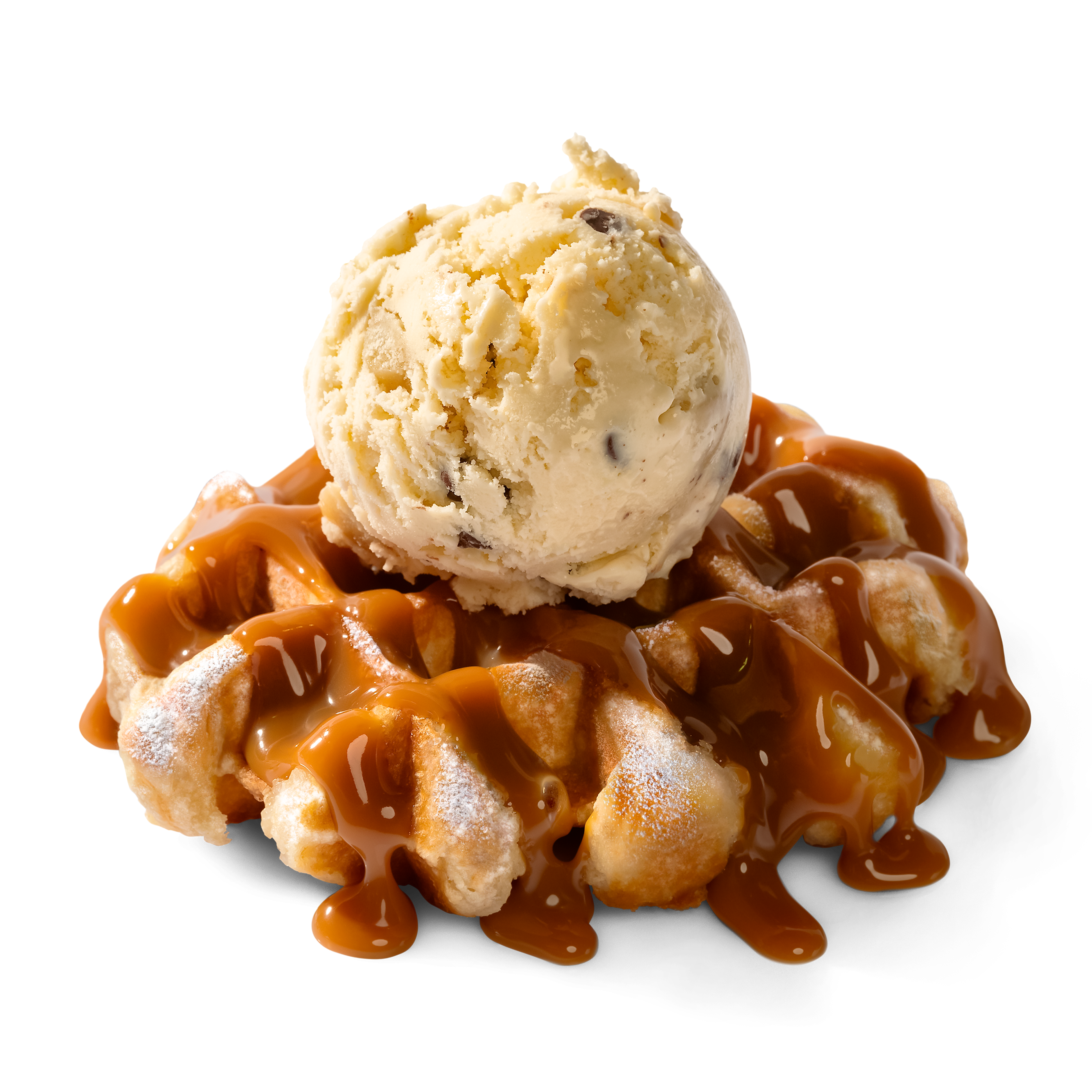 Waffly tasty Belgian waffle & ice cream with lashings of hot caramel fudge.