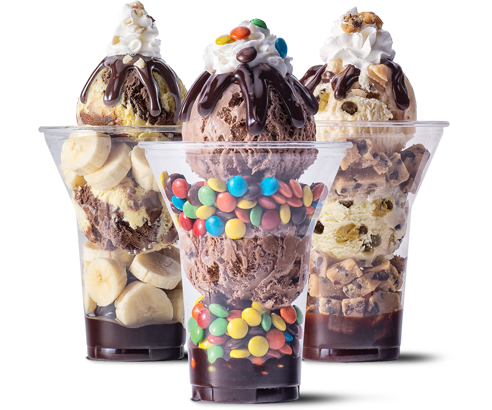 Two scoops chock-full of treats, hot fudge & whipped cream. Choose Banana Royale, Choc Rainbow Royale, Cookie Dough Overload or build your own